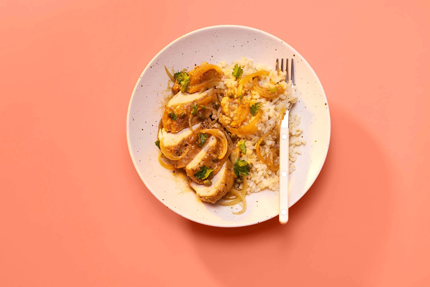 Heat olive oil in skillet over medium heat. Add chicken seasoned with salt and pepper. Sear on both sides for 2 minutes until slightly browned. Add to a greased slow cooker and top chicken with onion slices. Mix together broth, lemon juice, onion powder and garlic in a bowl. Pour this over the chicken, cover, and cook on low for 6 hours or high for 4 hours. Thirty minutes before it is done cooking, remove 1/2 cup of the liquid and pour it into a small bowl. Whisk in the cornstarch until smooth. Pour back into the slow cooker, followed by the lemon zest. Sprinkle capers over it all and finish cooking for 30 minutes or until gravy has thickened. Season with more salt and pepper if needed. Serve chicken with chopped fresh parsley on top.