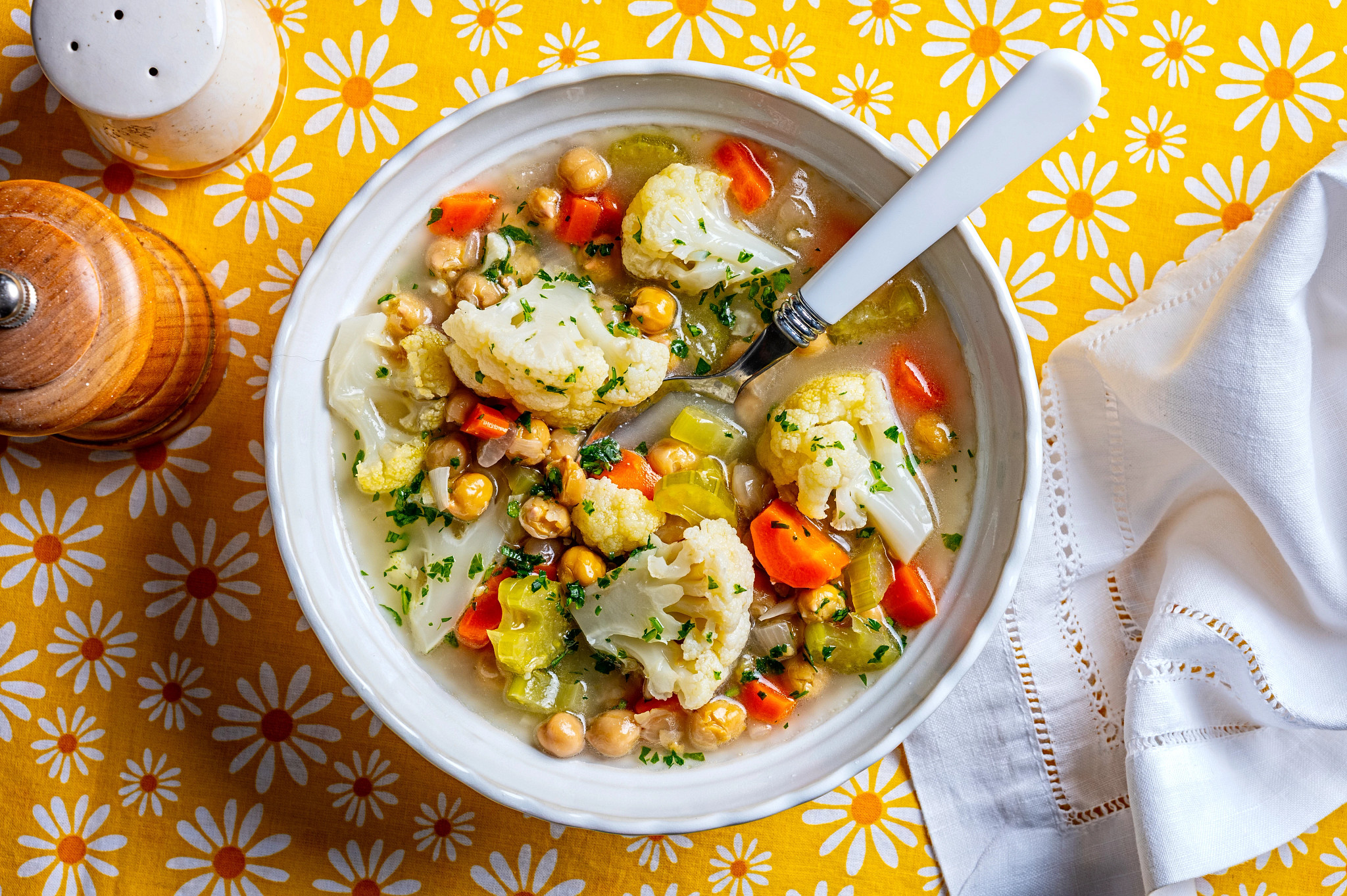 Put the oil in a pot over medium heat. Add the onion and sauté for a minute. Add the carrot, celery, cauliflower, parsley and chickpeas to the pot and barely cover with water. Bring to a boil with the lid on and then turn the heat to low to simmer. Let it cook for 15-20 minutes. Stir the tender cauliflower in to break it up and add the dissolved miso.