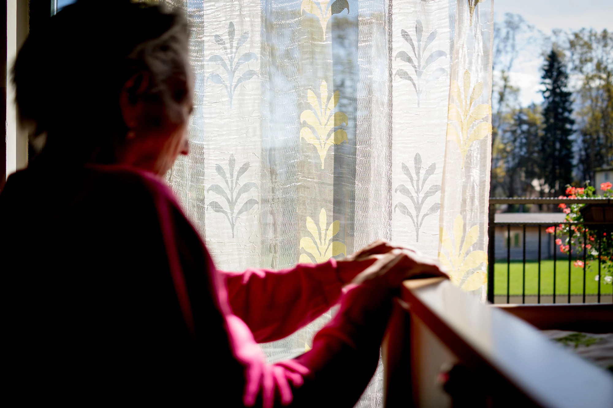 The way the Ring camera is aimed from its mount on the ceiling, I can only see Mom through the reflection in the mirrored sliding closet doors facing her. It just takes a bit of blowing up the