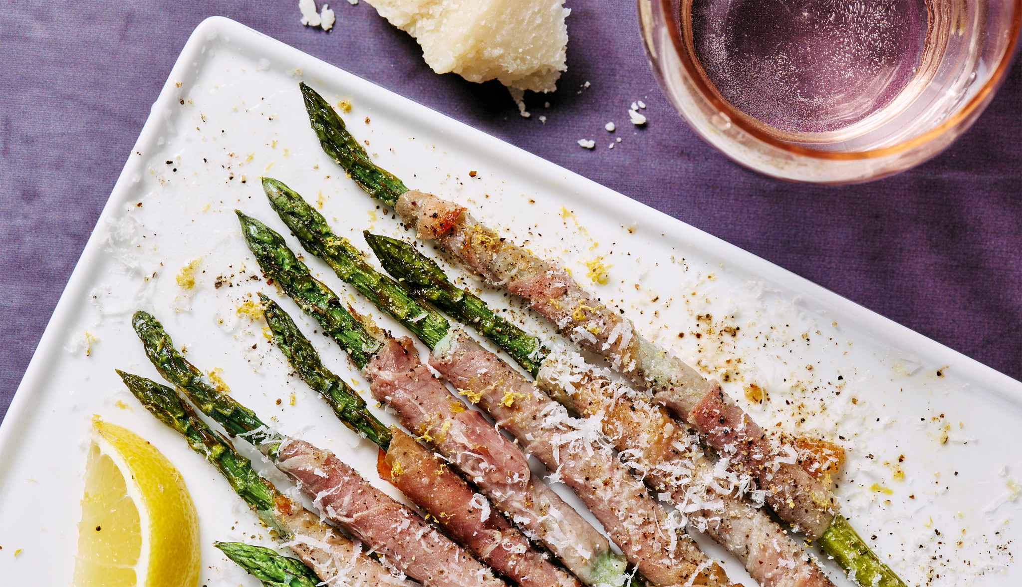 This simple appetizer is visually appealing on the plate and is enjoyable to eat with your hands. In fact, you and your partner can add to the romance by feeding the asparagus spears to each other!